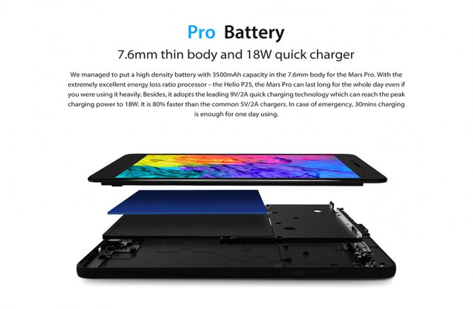 Экран у смартфона качественный и вполне может тягаться с более дорогими соперниками: 5.5", Amoled-матрица, разрешение FullHD, стекло 2.5D, защитное стекло Gorilla Glass 3. Что еще нужно для того, чтобы радовать глаз пользователя? Углы обзора большие, цветопередача на должном уровне. Данный дисплей отлично подойдёт для игр и просмотра фильмов. Что касается производительности, то тут Vernee Mars Pro также сможет порадовать своего владельца. За скорость работы смартфона отвечает восьмиядерный чип MediaTek Helio P25 с рабочей частотой 2.5 ГГц. С графикой работает видеоускоритель Mali T-880. Под пользовательскую память производитель выделил 64 ГБ (есть возможность расширить до 256 ГБ), а под оперативную аж 6 ГБ - король многозадачности. Благодаря такому железу Vernee Mars Pro набирает в синтетическом тесте Антуту очень даже неплохие цифры - 85 000 очков. Для большинства игр и приложений этого будет вполне хватать. С камерами у Vernee Mars Pro дела обстоят не очень хорошо. Они, наверное, самая слабая часть смартфона: фронтальная - 5 МП, основная - 13 МП. Мы уверены в том, что девайс будет снимать неплохо, но только при условии хорошего освещения. От 100% зарядки Vernee Mars Pro будет с уверенностью жить один день. Стоит сказать, что у смартфона есть функция быстрой зарядки, поэтому долго с Vernee Mars Pro у розетки вам сидеть не придется. К владельцу Vernee Mars Pro приедет с Андроид 7.0 на борту. Свой отзыв о Vernee Mars Pro мы оставим в виде его основных плюсов и минусов.