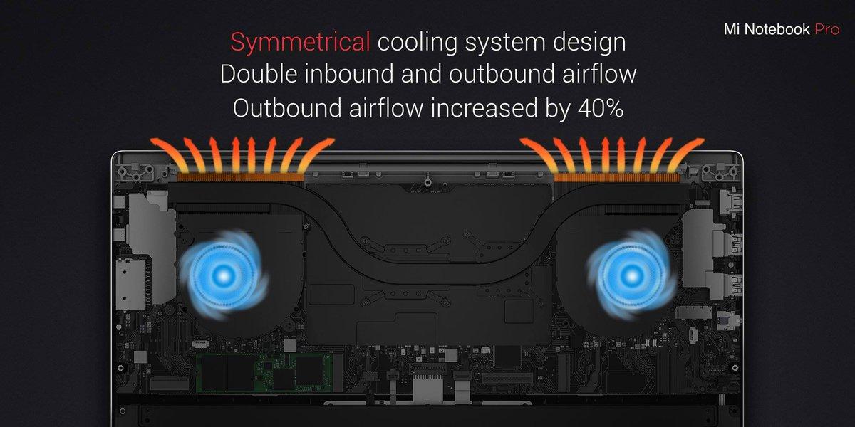 Не забыли на презентации Xiaomi Mi Notebook Pro рассказать и об эффективной системе охлаждения. Честно говоря, придраться не к чему, она выполнена добротно. Самая горячая часть ноутбука расположена по центру со сдвигом ближе к краю экрана, а теплоотводящие трубки переносят тепло на кулеры, которые расположились симметрично вокруг источника тепла. Инженеры Xiaomi рассказали, что такая конструктивная особенность позволяет обеспечить на 40% более сильный поток воздуха, а значит и лучшее охлаждение.  Учитывая то, что в Xiaomi Mi Notebook Pro стоят процессоры с индексом U, то новинка действительно окажется холодной даже под нагрузкой.