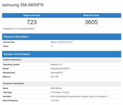 Если верить бенчмарку, то младшая модель Galaxy A6 обзаведется фирменным чипом Exynos 7870, который нам уже известен по модели Galaxy A3 2017. Это весьма неплохой чип, который состоит из восьми ядер Cortex-A53 с частотой до 1,6 ГГц. Процессорный блок у него как раз и является хорошим, а вот графическая составляющая в виде Mali-T830 со всего одним ядром оставляет желать лучшего. По итогу мы имеем производительность по GeekBench на уровне 723/3605+ баллов и около 46000 очков в Antutu. Такой производительности хватит для всех повседневных задач, но никак не для игр.